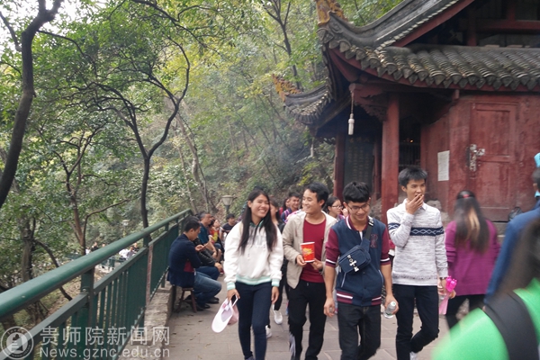 泰国学生们还参观了弘福寺,该寺建于明末清初,是贵州著名的佛寺之一,泰国学生虚心向中国学生学习中国拜佛的礼节,并和中国学生交流中泰佛教文化的异同之处,这似乎也缓解了泰国学生对家乡的思念。黔灵山景区设有观光缆车,但同学们没有坐缆车,而是选择靠自己的毅力爬上山顶,他们用自己在课堂上刚学过的“不经一番彻骨寒,哪得梅花扑鼻香”来概括爬山的过程。