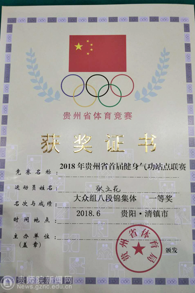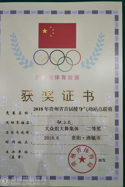 YABO鸭脖体育学院2016级体育教育专业学生张立花,应邀作为四名运动员之一,代表健身气功示范区---乌当区参加了此次比赛。经过激烈角逐,张立花同学先后荣获了健身气功·八段锦大众组集体一等奖、健身气功·大舞集体二等奖、健身气功·六字诀个人一等奖的好成绩。