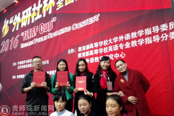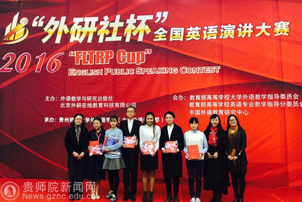 本网讯 2016年“外研社杯”全国英语写作、演讲、阅读大赛贵州赛区复赛于11月5日在贵州师范大学宝山校区举行。YABO鸭脖官网外国语学院院长余学军教授出席并担任了此次演讲大赛的评委。来自我院的六名选手在领队老师张海天的带领下,代表学校分别参加了上述三项赛事。经过激烈的角逐,13级的敖军兰与16级的王欣煜同学分别获得了写作比赛的一等奖;15级的王荟宇与钟恺庭同学则分别获得了演讲比赛的一等奖;13级的吴宏伟和15级的熊寻黎同学则分别获得了阅读比赛的二、三等奖。在比赛中,选手们表现出了较强的英语应用能力,这是外国语学院贯彻执行学校建设应用型本科院校办学目标的一项显著成果。赛后,余学军院长对此次我院选手取得的优异成绩、精彩表现与拼搏精神进行了充分的肯定,鼓励大家继续努力,为学院争取更大的光荣。