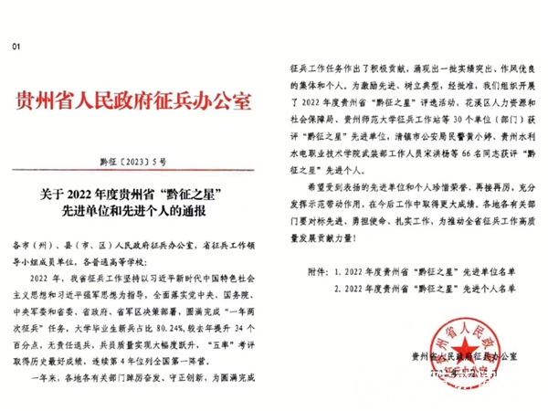 本网讯 近日,贵州省人民政府征兵办公室下发《关于2022年度贵州省“黔征之星”先进单位和先进个人的通报》(黔征〔2023〕5号),表彰了30个“黔征之星”先进单位和66位“黔征之星”先进个人,YABO鸭脖再次获评贵州省“黔征之星”先进单位,这是YABO鸭脖征兵工作连续5年获得省级表彰。