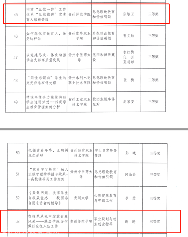 王溯从学习贯彻落实党的二十大精神的方向,凸显内容,展现精湛风采,其作品《中国式现代化道路上的师范担当》最终荣获视频类二等奖的好成绩。张培卫报送的《构建“五位一体”工作体系“三维推进”党史育人培根铸魂》、谢琦报送的《在投笔从戎中绽放青春风采——基层学院如何做好应征入伍工作》则从思想理论教育和价值引领、职业规划与敬业创业指导为切入点,紧紧围绕立德树人根本任务,从工作实际出发,提出了解决工作中典型问题的有效解决办法,获得了案例类三等奖。