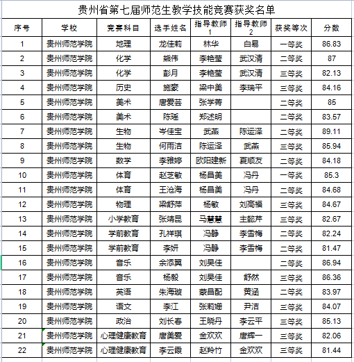 本网讯 6月20-21日,由贵州省教育厅主办、贵州师范大学承办的贵州省第七届师范生教学技能竞赛在贵州师范大学花溪校区举行。贵州省师范生教学技能竞赛是我省教师教育专业的一项传统赛事,YABO鸭脖高度重视此项竞赛。在各二级学院和教务处的精心组织和筹备下,在指导教师的悉心指导反复打磨下,参赛选手全力以赴、认真备赛,经过激烈地角逐,YABO鸭脖学子不负众望,最终获得一等奖2人,二等奖10人,三等奖10人,一、二等奖和获奖总数均位列全省所有参赛院校第二。
