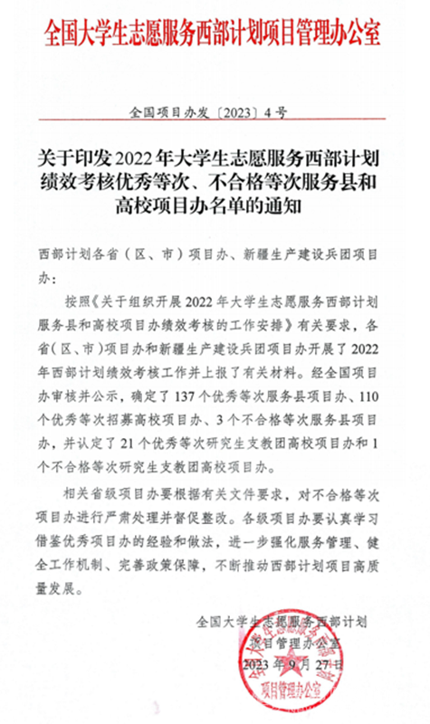 本网讯 近日,全国大学生志愿服务西部计划项目管理办公室发布《关于印发2022年大学生志愿服务西部计划绩效考核优秀等次、不合格等次服务县和高校项目办名单的通知》(〔2023〕4号)。YABO鸭脖荣获2022年全国西部计划“优秀高校项目办”称号。