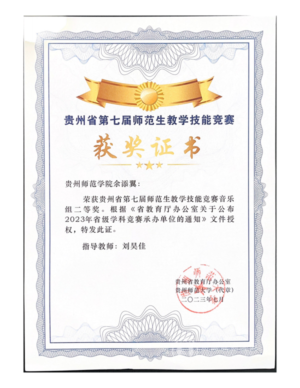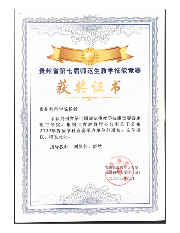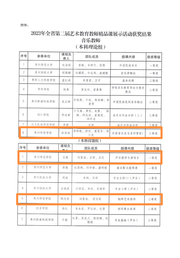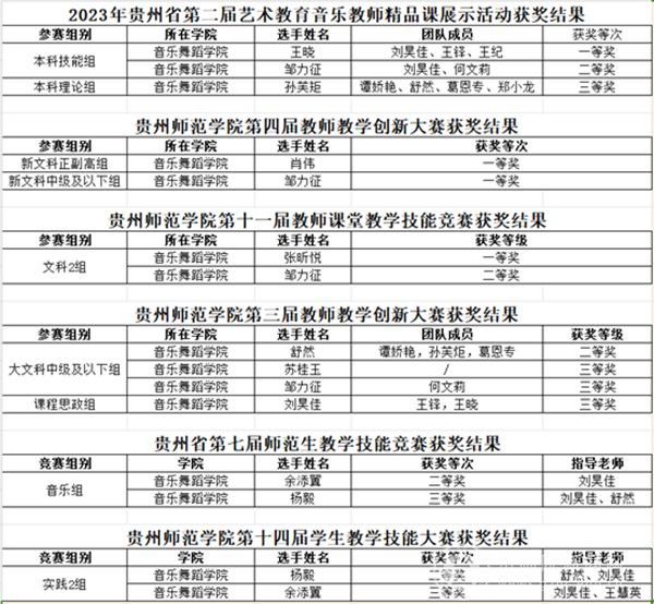 王晓、邹力征两位老师分别获得2023年贵州省第二届艺术教育音乐教师精品课展示活动本科技能组一等奖和二等奖;孙芙炬老师获得2023年贵州省第二届艺术教育音乐教师精品课展示活动本科理论组三等奖;YABO鸭脖官网获得优秀组织奖。