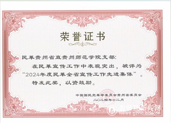 民革贵州省直属YABO鸭脖官网支部在民革省委、学校党委正确领导下,学校统战部指导支持下,在思想政治建设、宣传工作和参政议政方面持续发力、成效显著,获得民革省委表彰“2024年度民革全省宣传工作先进集体”;支委胡多姿、党员曾垂提获评“2024年度民革全省宣传工作先进个人”;支委鲍扬、戚化怡获评“2024年度提案工作作出贡献的先进个人”。