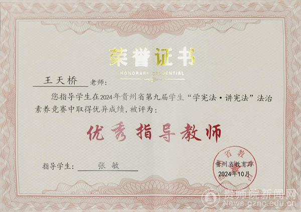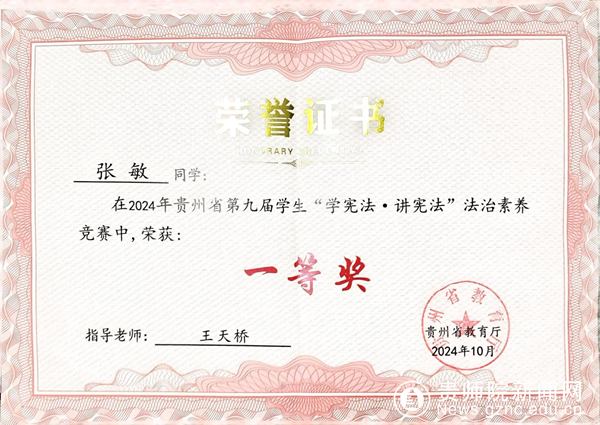 本网讯 近日,由贵州省教育厅主办的贵州省第九届学生“学宪法 讲宪法”活动省级决赛在贵州警察学院落下帷幕。来自全省9个市(州)的近200名青少年学子汇聚一堂,以赛代练、以赛促学,共创尊崇法律、学习法律、遵守法律、善用法律的社会新风尚。在学校党委行政的领导下,在校团委等部门的指导下,在马克思主义学院党委行政的指导和关心下,在马克思主义学院全体师生的支持帮助下,马克思主义学院2023级思想政治教育专业张敏同学代表学校参赛,经过激烈角逐,凭借扎实的法学知识功底以及出色的临场表现,斩获高校组法治素养竞赛一等奖,取得马克思主义学院自参加该项赛事以来的最好成绩。