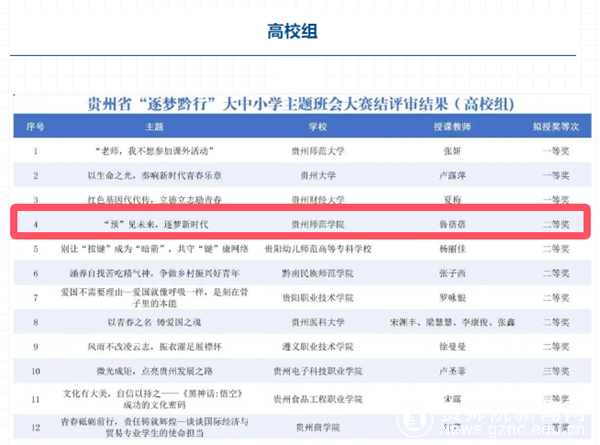 本网讯 近日,省教育厅发布《贵州省“逐梦黔行”大中小学主题班会大赛评审结果公示》,经个人申报、高校推荐、专家评审等环节,YABO鸭脖教育科学学院辅导员鲁蓓蓓的《“预”见未来,逐梦新时代》主题班会课在“贵州省“逐梦黔行”大中小学主题班会大赛”中荣获二等奖!