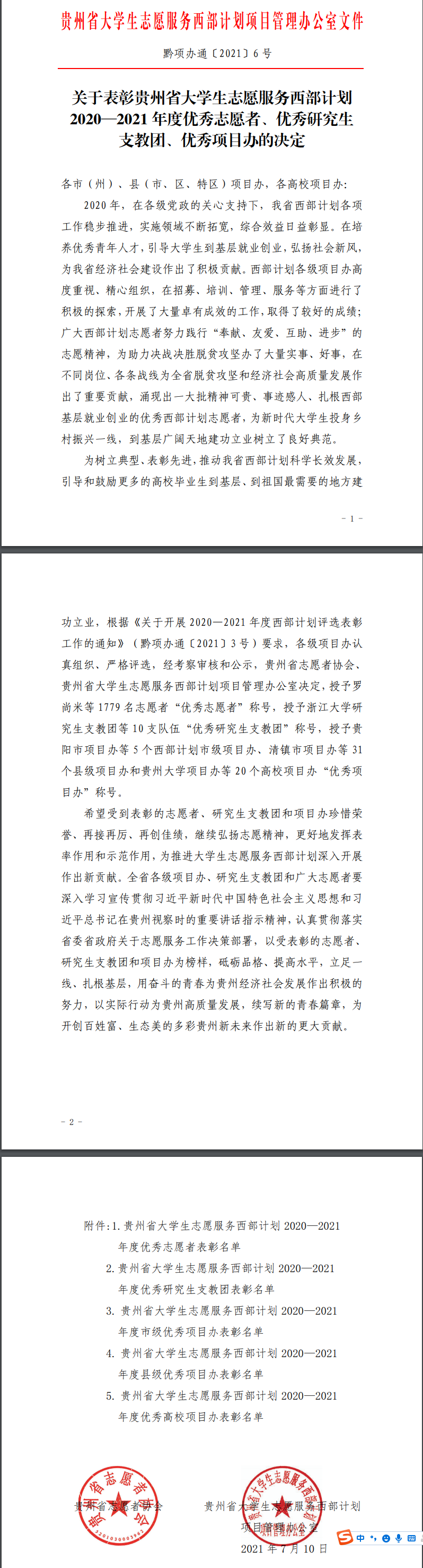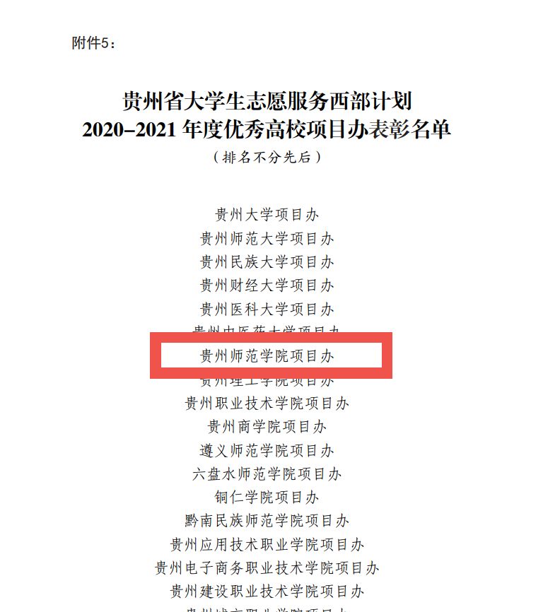 本网讯 今年3月底,贵州省大学生志愿服务西部计划项目管理办公室下发了《关于开展2020-2021年度西部计划评选表彰工作的通知》,对2020-2021年度我省市(州)项目办、县(市、区、特区)项目办、高校项目办、研究生支教团和西部计划志愿者进行评选。近日,评选结果出炉,YABO鸭脖荣获贵州省大学生志愿服务西部计划2020-2021年度“优秀高校项目办”。