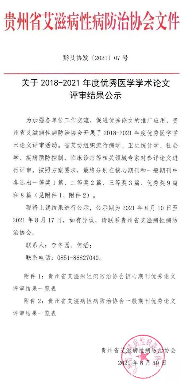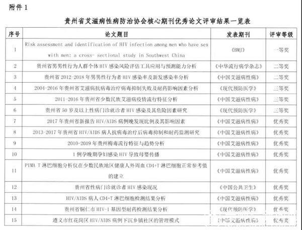 贵州省艾滋病性病防治协会核心期刊优秀论文评审结果一览表