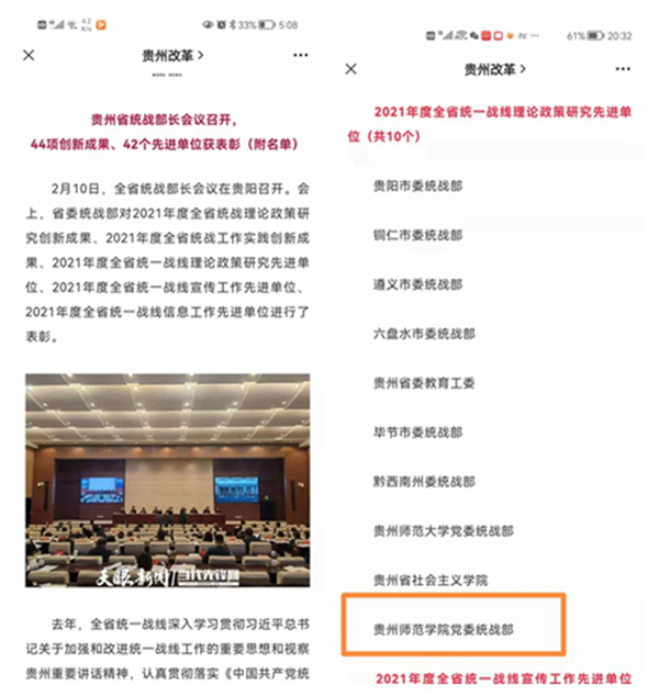 本网讯 近日,中共贵州省委统战部通报表彰2021年度全省统战理论政策研究创新成果、统战工作实践创新成果和理论政策研究、宣传工作、信息工作先进单位,其中,YABO鸭脖党委统战部荣获“2021年度全省统一战线理论政策研究先进单位”称号。