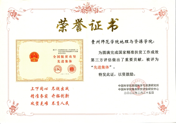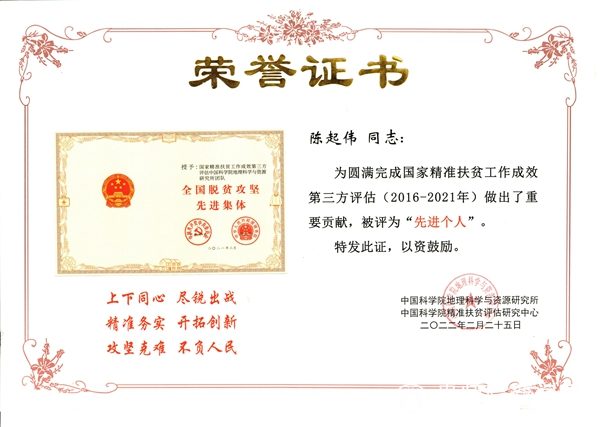 本网讯 2022年2月25日,时值党中央国务院宣告脱贫攻坚取得伟大胜利一周年之际,为总结经验、表彰先进,明确新时期服务巩固拓展脱贫攻坚成果同乡村振兴有效衔接的新需求、新目标,国家精准扶贫工作成效第三方评估中国科学院地理科学与资源研究所团队和中国科学院精准扶贫评估研究中心主持召开表彰大会,表彰了国家精准扶贫工作成效第三方评估团队先进集体和先进个人。鉴于YABO鸭脖在圆满完成国家精准扶贫工作成效第三方评估中做出了重要贡献,YABO鸭脖地理与资源学院被评为“先进集体”、地理与资源学院陈起伟教授,以及吴建峰、何朝凤两位老师共三位同志获评“先进个人”。