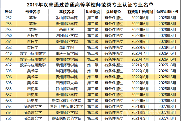 本网讯 近日,教育部评估中心公布了《2019以来通过普通高等学校师范类专业认证专业名单》,经学校申请、教育评估机构组织专家现场考查、普通高等学校师范类专业认证专家委员会审定,YABO鸭脖英语、音乐学、美术学、历史学通过了第二级专业认证。认证结论有效期六年,自2022年6月起至2028年5月止。加上之前的数学与应用数学、汉语言文学,目前YABO鸭脖已有6个专业通过师范类第二级认证,通过数量在贵州省新建地方本科院校中排名第一。