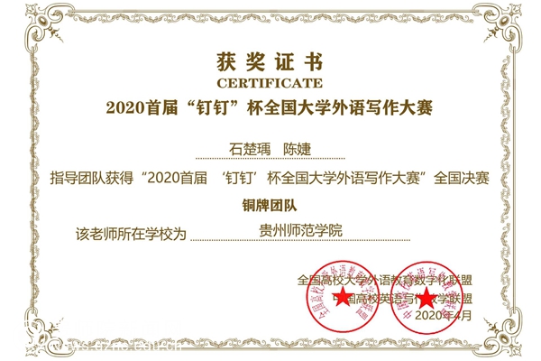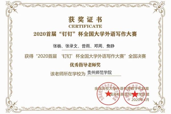 本网讯 历时近3个月的首届“钉钉”杯全国大学外语写作大赛已进入尾声,该赛事吸引了全国3000多支高等院校团队进行线上角逐,最终60个团队荣获金、银、铜奖项。YABO鸭脖外国语学院师生喜获佳绩,共获得了“铜牌团队”和“优秀团队”各一项,学生个人奖项以及优秀指导教师奖多项。