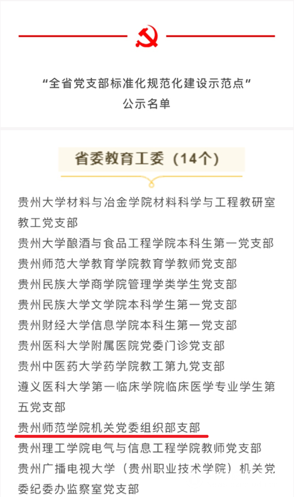 本网讯 2020年8月10日,中共贵州省委组织部公示了第一批“全省党支部标准化规范化建设示范点”拟命名对象名单,在公示的200个示范点中,省委教育工委共有14个院校基层党支部入选,YABO鸭脖机关党委组织部支部入选“贵州省党支部标准化规范化建设示范点”。