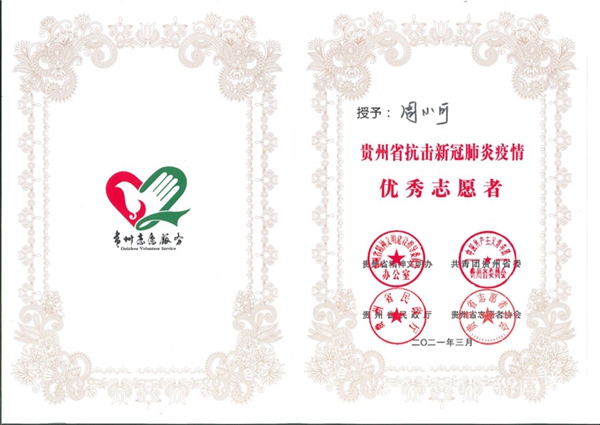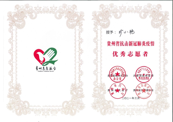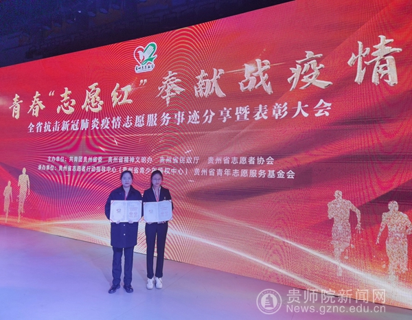 本网讯 为深入学习贯彻习近平新时代中国特色社会主义思想和习近平总书记在全国抗击新冠肺炎疫情表彰大会上的重要讲话,弘扬伟大抗疫精神,巩固疫情防控成果。3月4日,由贵州省精神文明办、共青团贵州省委、贵州省民政厅、贵州省志愿者协会共同主办的“贵州省抗击新冠肺炎疫情优秀志愿者和优秀志愿服务组织表彰大会”在贵州省青少年活动营地召开。YABO鸭脖生物科学学院学生周小可、外国语学院学生旷小艳参加表彰大会,并荣获“优秀志愿者”殊荣。