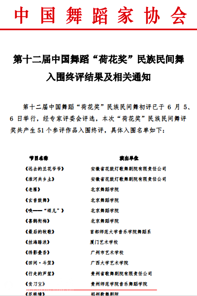 本网讯 近日,由中国文学艺术界联合会、中国舞蹈家协会主办的中国舞蹈“荷花奖”初评比赛在北京举行,YABO鸭脖音乐舞蹈学院选送的作品《贵刀宝》成功进入下一轮比赛。此次活动共收到全国五百多个作品参与评选,经专家评委会层层选拔,共产生51个作品入围决赛。