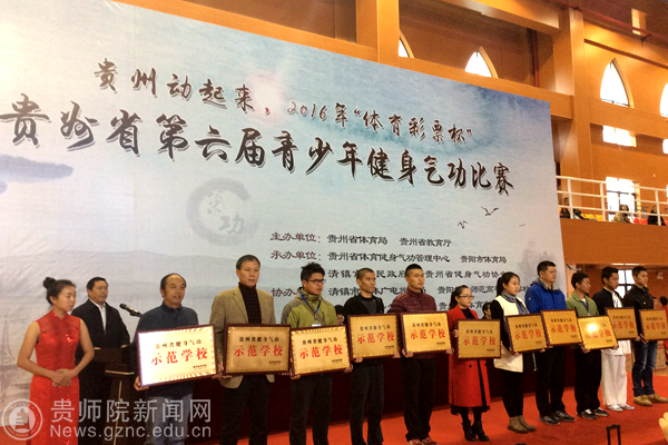 本网讯 11月12日—13日,由贵州省体育局、贵州省教育厅联合主办的“体育彩票杯”贵州省第六届青少年健身气功比赛在清镇市举行,省体育局副局长肖俊、省教工委副书记李涛、省体育局健身气功管理中心主任李建红、省教育厅体卫艺处副处长严卫、省体育局健身气功管理中心副主任陈智勇参加开幕,并在开幕式上对荣获“健身气功示范学校”单位进行授牌。YABO鸭脖体育学院院长黄伟明应邀出席此次授牌仪式。