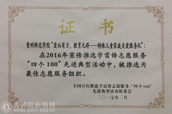 本网讯 为积极培育和践行社会主义核心价值观,大力弘扬奉献友爱互助进步的志愿精神,进一步推动学雷锋志愿服务制度化常态化,中央宣传部、中央文明办、民政部、环保部、文化部、国务院国资委、全国总工会、共青团中央、全国妇联、中国文联、中国残联,人民日报、光明日报、中央电台、中央电视台共同组织开展2016年宣传推选100个最美志愿者、100个最佳志愿服务组织、100个最佳志愿服务项目、100个最美志愿服务社区活动(以下简称2016年宣传推选学雷锋志愿服务“四个100”先进典型活动)。经过组委会多方评定,YABO鸭脖教育科学学院的“爱而有方,教育无碍——特殊儿童家庭关爱服务队”荣获2016年宣传推选学雷锋志愿服务“四个100”先进典型活动“全国最佳志愿服务组织”,并作为全国获奖典型项目于2017年2月28日在中宣部召开的全国学雷锋志愿服务工作座谈会上予以表彰。