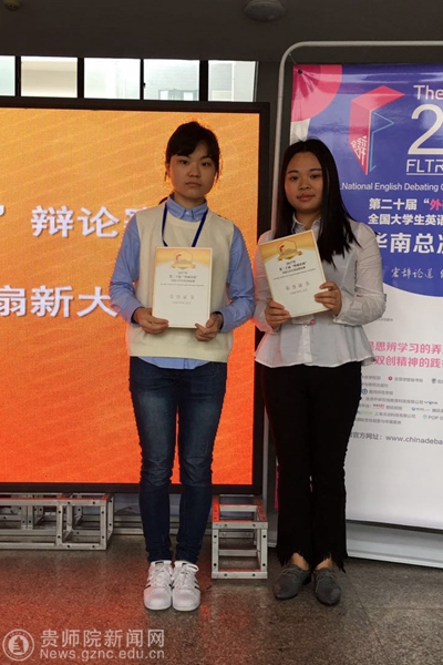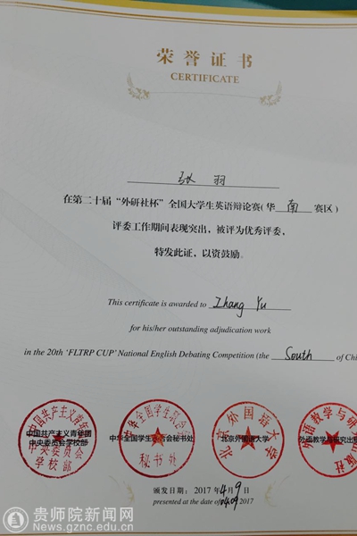 本网讯 第二十届“外研社杯”全国大学生英语辩论赛(FLTRP Cup National English Debating Competition)华南赛区比赛于4月7日至9日在湖北黄冈师范学院隆重举行。YABO鸭脖英语辩论队15级英语专业钟恺庭、王荟宇两位同学代表YABO鸭脖参赛,最终荣获华南赛区三等奖。YABO鸭脖英语演讲与辩论社教练张羽老师受组委会邀请担任评委,评审期间兢兢业业,专业水准高,获“优秀评委奖”(Outstanding Adjudication Award)及指导教师三等奖两项荣誉。