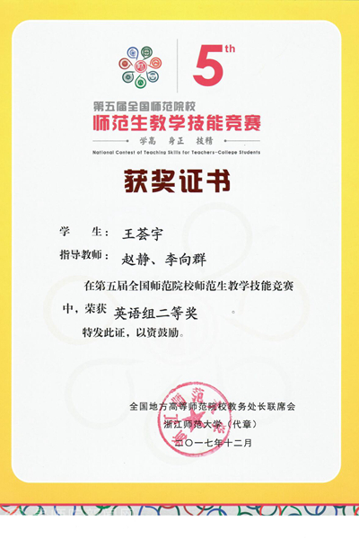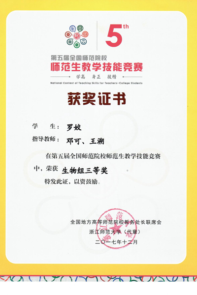 本网讯 12月9日,由全国地方高等师范院校教务处长联席会主办、浙江师范大学承办的第五届全国师范院校师范生教学技能竞赛圆满落下帷幕。YABO鸭脖外国语学院王荟宇荣获二等奖,数计学院付栾钧、化生学院罗姣荣获三等奖。