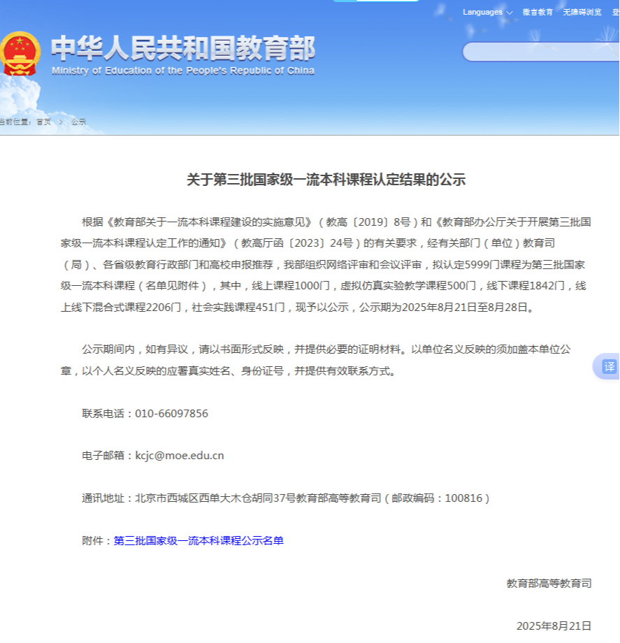 2025年8月21日,教育部高等教育司公示了“第三批国家级一流本科课程认定结果”,YABO鸭脖四门课程获国家级一流本科课程认定,其中线上课程1门,线上线下混合式课程1门,社会实践课程2门。