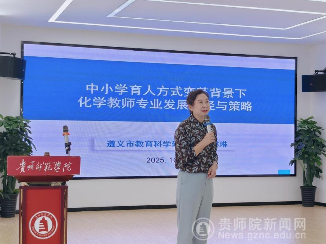 为深入贯彻落实新时代教师队伍建设要求,切实提升师范生培养质量,10月17日,化学与材料学院在学校“一站式”学生社区服务中心举行“培师德、铸师魂、强师能”系列活动。本次活动特邀遵义市教育科学研究院院长、贵州省骨干教师王琳琳作《中小学育人方式变革背景下化学教师专业发展路径与策略》讲座,2023级、2024级化学专业全体学生和化学专业教师参加学习。活动由学院副院长李艳莹主持。