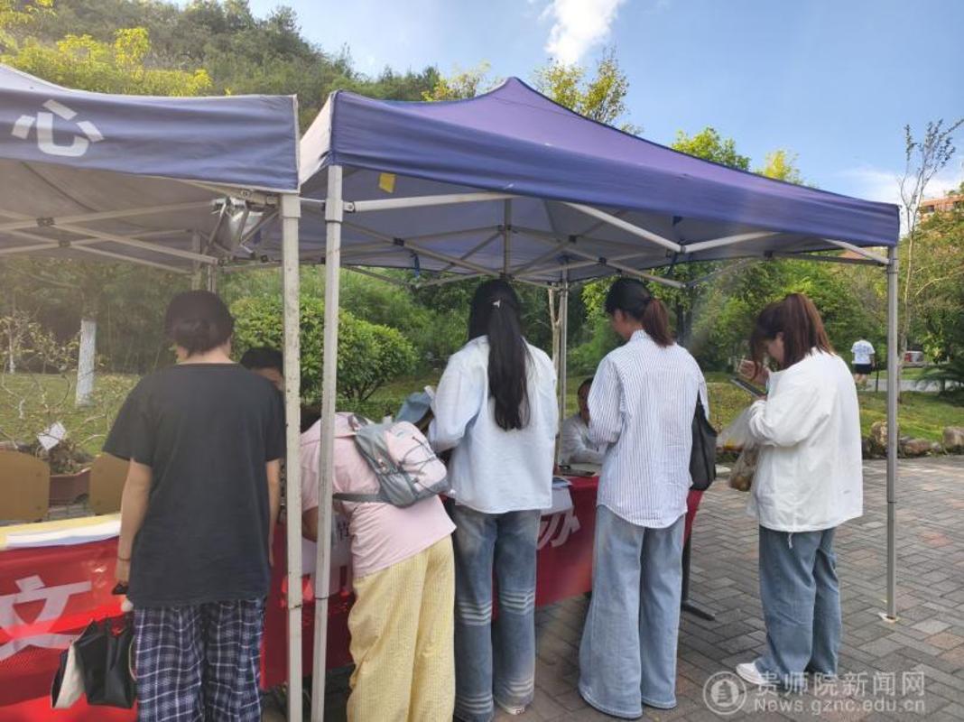 活动精心设计了三大特色环节,既充满趣味性,又富含知识性。“贵州知多少” 知识问答率先启动,工作人员准备 20 道涵盖贵州地理、文化、民俗、美食的基础题,难度贴近贵州特色,既有 “贵州简称是什么”“‘贵州第一山’是哪座” 等地理题,也有 “酸汤鱼酸汤分类”“FAST 所在县” 等文化与物产题。参与者们热情高涨,纷纷排队参与答题,只要答对三道题目,就能顺利通关并获得精美小贴纸作为奖励。不少学生表示,答题不仅能学习到新知识,也加深了对贵州的兴趣。