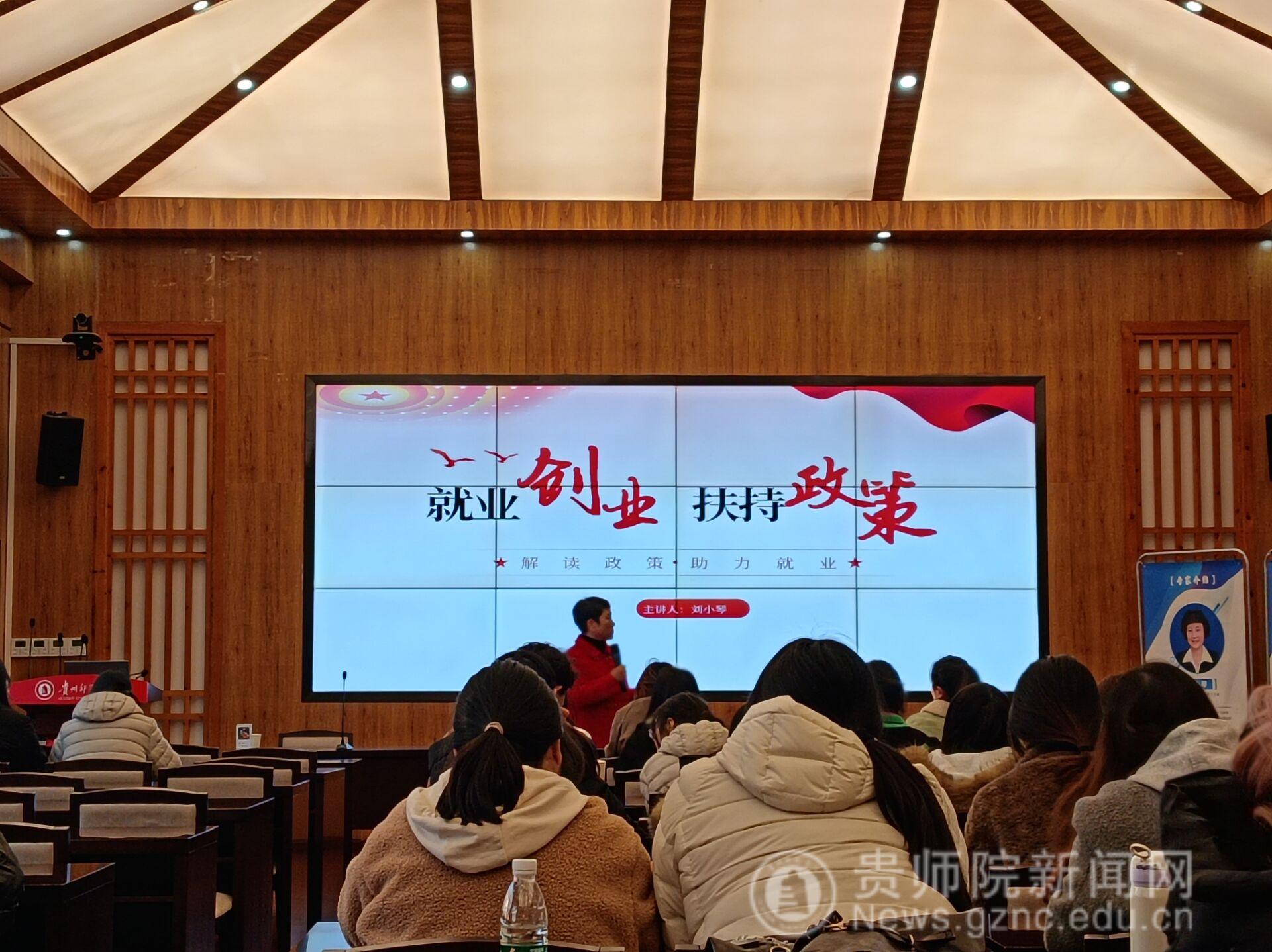 为帮助学生明晰就业形势、掌握求职技能、规划职业方向,2025年11月21日下午由乌当区人力资源和社会保障局与YABO鸭脖官网教育科学学院联合策划的“职引黔程·共创未来”职业指导系列讲座,在学校印山书院顺利开展。活动特邀贵州省省级劳务品牌专家、省级创业指导专家刘小琴,企业管理咨询专家、资深人才测评官蒲天竹担任主讲,教育科学学院党委副书记傅小芳、辅导员李琴及22级应用心理学班、艺术教育专业120余名学生共同参加本次活动。