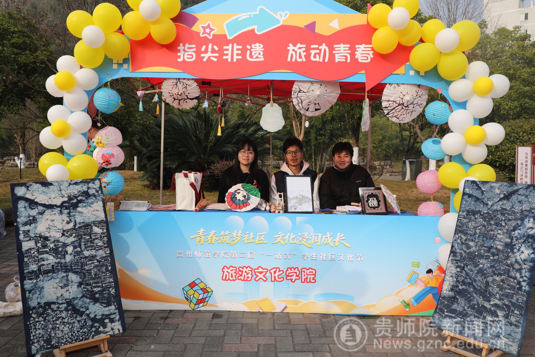 在匠心成果区——“指尖非遗,创艺工坊”,学院集中呈现了系列手工非遗作品与创意手作。展台上,精美的非遗油纸伞色彩典雅、工艺细腻,非遗扇面绘制精巧、意蕴悠长,手工纸灯笼造型别致、光影温馨,色彩浓郁的蜡染布艺更是展现出独特的民族风情。同时,学院学生还充分发挥创意,利用气球等综合材料,制作出众多融合旅游与文化主题的手工作品,将传统技艺与现代审美、专业元素巧妙结合,吸引众多师生驻足观赏、连连赞叹,生动体现了旅游文化学院在文化传承与创新实践方面的探索与成果。