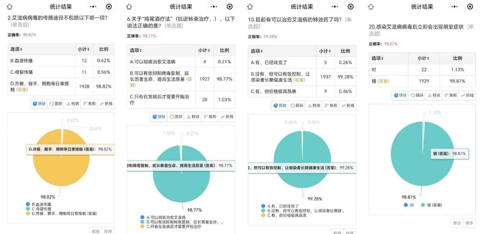 “这种形式比传统讲座更灵活,碎片时间就能学知识,错题解析还能帮我们理清误区,特别实用!”学生在反馈中表示,线上答题的互动性与趣味性让防艾知识学习变得轻松高效。相较于传统单向灌输的宣传模式,本次活动突破性地构建了“主动参与式”科普平台。在沉浸式答题过程中,学生不仅系统强化了自我保护技能,更通过对感染者权益、社会包容等相关题目的思考,深化了对艾滋病群体的理解与关怀,有效消解了认知偏见,为营造平等包容的校园氛围奠定了思想基础。